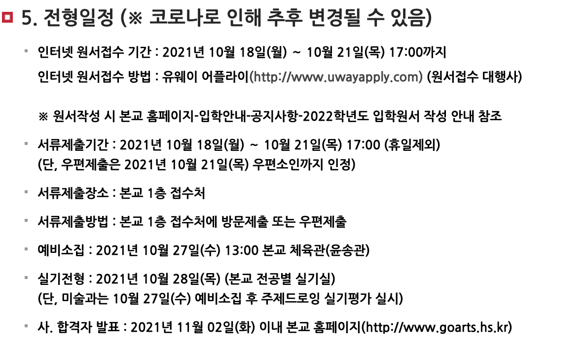 | 2022학년도 경기 예술 고등학교 바이올린 입시곡, 선발인원, 전형일정 (경기예고) (0) | 2021.07.08 |
